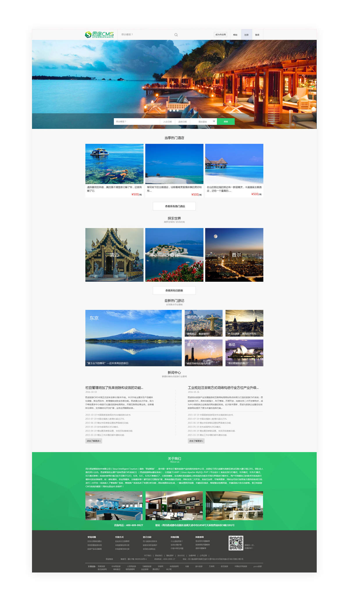 (網站首頁)此套模板為酒店首頁模板,適合以預訂酒店為主要業務的旅游網站使用。模板界面清晰簡潔,便于篩選,符合用戶操作習慣。首頁游記模塊更加豐富網站內容,提升網站的整體質量。是一套推薦使用的熱門酒店首頁模板。*該模板不支持換膚。